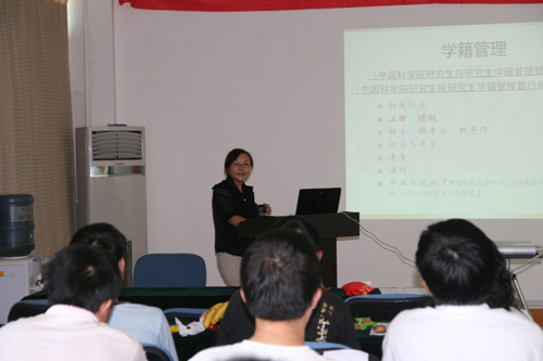 第二场讲座由负责研究生日常工作的付玉芹主讲,她就中国科学院研究生院、挂靠所以及我所有关研究生的要求,以及研究生关心的户籍、学位、住宿等问题作了介绍,并着重解读了研究生的日常管理条例及入所学习的注意事项。